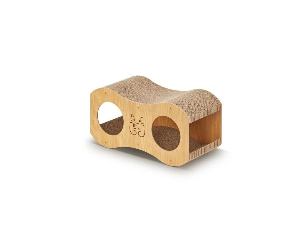 Toto škrabadlo pro kočky vyrobené z ekologické vlnité lepenky je praktickým a funkčním vybavením pro každou domácnost s kočkou. Spojuje tři funkce – škrabadlo, domeček a lehátko – a poskytuje vašemu mazlíčkovi místo k broušení drápků, odpočinku a hraní. Minimalistický design v odstínech béžové a hnědé dělá z produktu perfektní doplněk do každého interiéru.